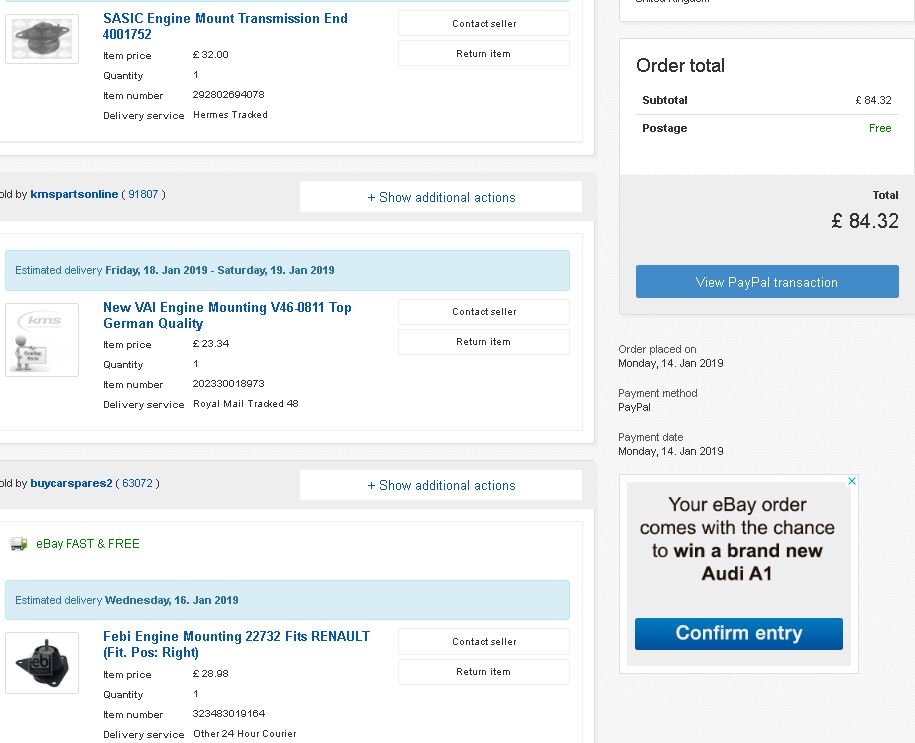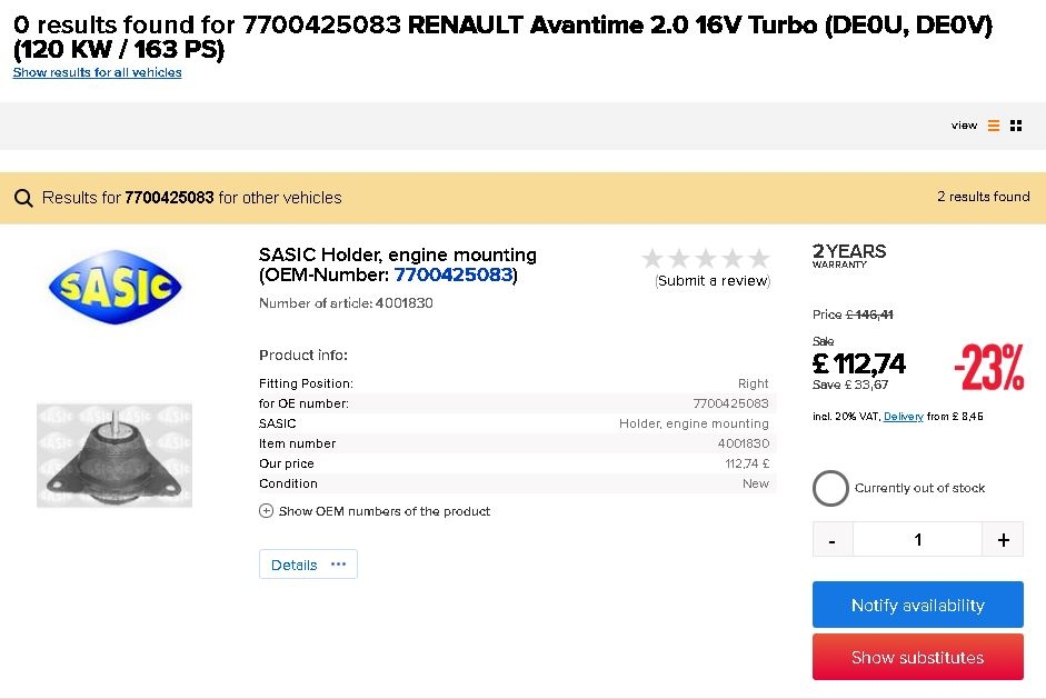 *poofff* another £100 or so dropped into Roger for engine mounts. While Autodoc is good, occasionally they have no stock or bonkers pricing or both as illustrated below. Went with Ebay various merchants to get the parts. Thanks again Mr Kaljo. One or all of the engine mounts will need replacing probably. If not, i have some spares!