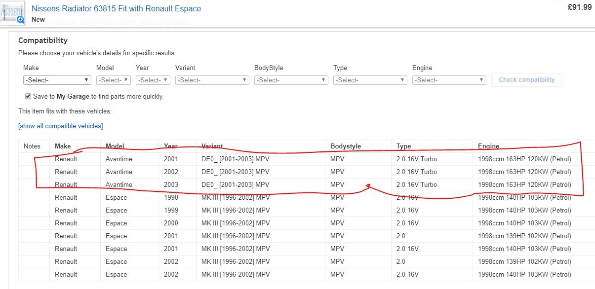 Right radiator saga rolls on with us topping up every 10 miles. The radiator ordered is definitely 63851A, paperwork says so and so does the radiator serial number. 63851A definitely does not fit a 2.0T Avantime. Differences: