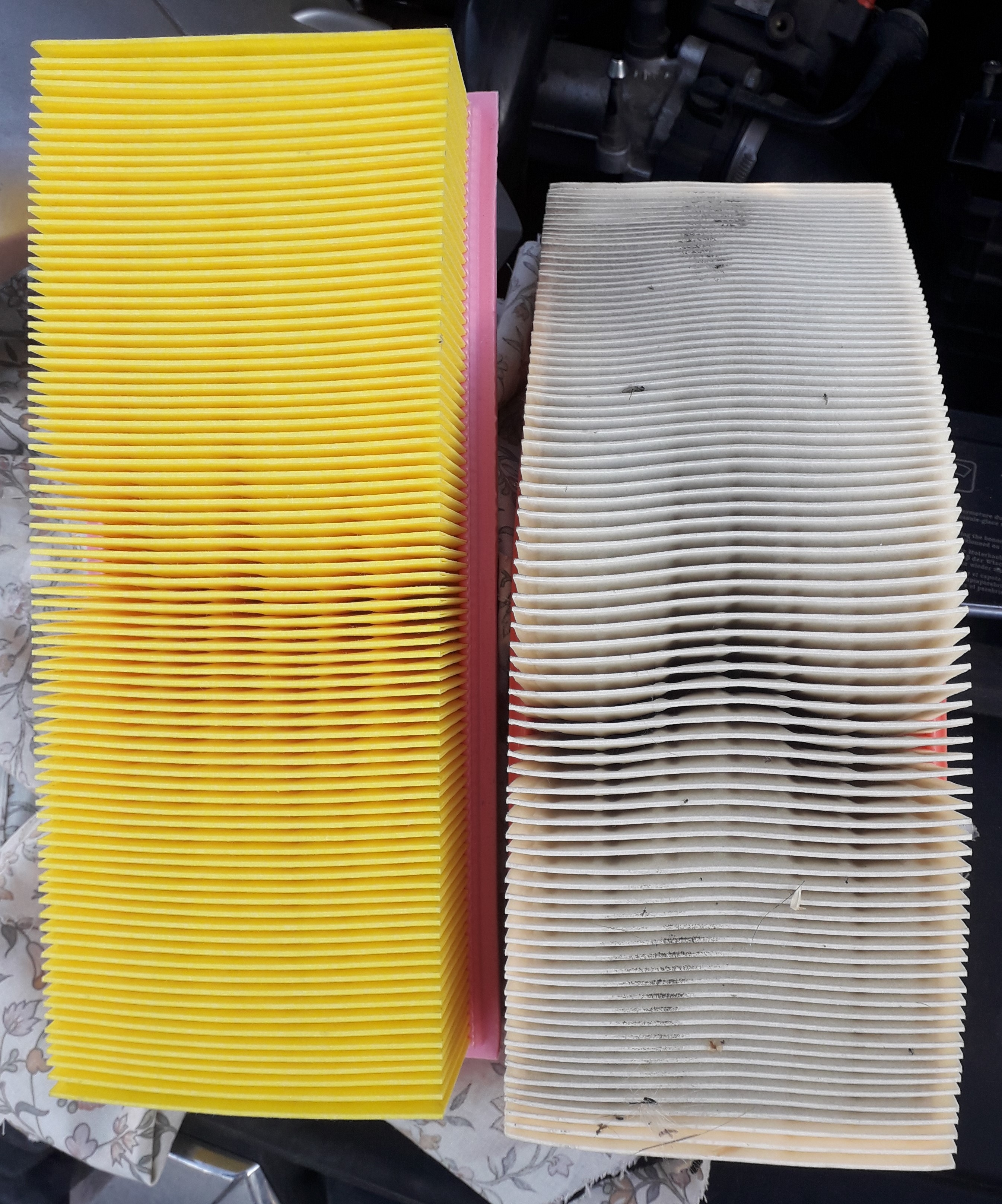Everybody else: snooze yer luze Champion air filter in, not particularly dirty but on a micro level who knows. I think 7000 miles is enough for a filter that sucks in XX million litres of air during that time. I could work it out, but life is too short. Or is it? 2000 revs per min = 4000 litres of air per min. Average 35 mph, 7000ish miles. =200 hours driving 200 x60 mins=12000mins driving 12000x4000=48,000,000 litres lets round it to 50 million litres.